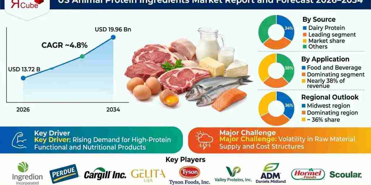 The Report Cube, a leading provider of market intelligence and strategic research solutions, has officially released its latest study titled "US Animal Protein Ingredients Market - Opportunity Analysis and Industry Forecast (2026-2034)." The report projects the size of US Animal Protein Ingredients market to be valued at USD 19.96 Billion by the end of the forecast period, expanding at a compound annual growth rate (CAGR) of 4.8%.